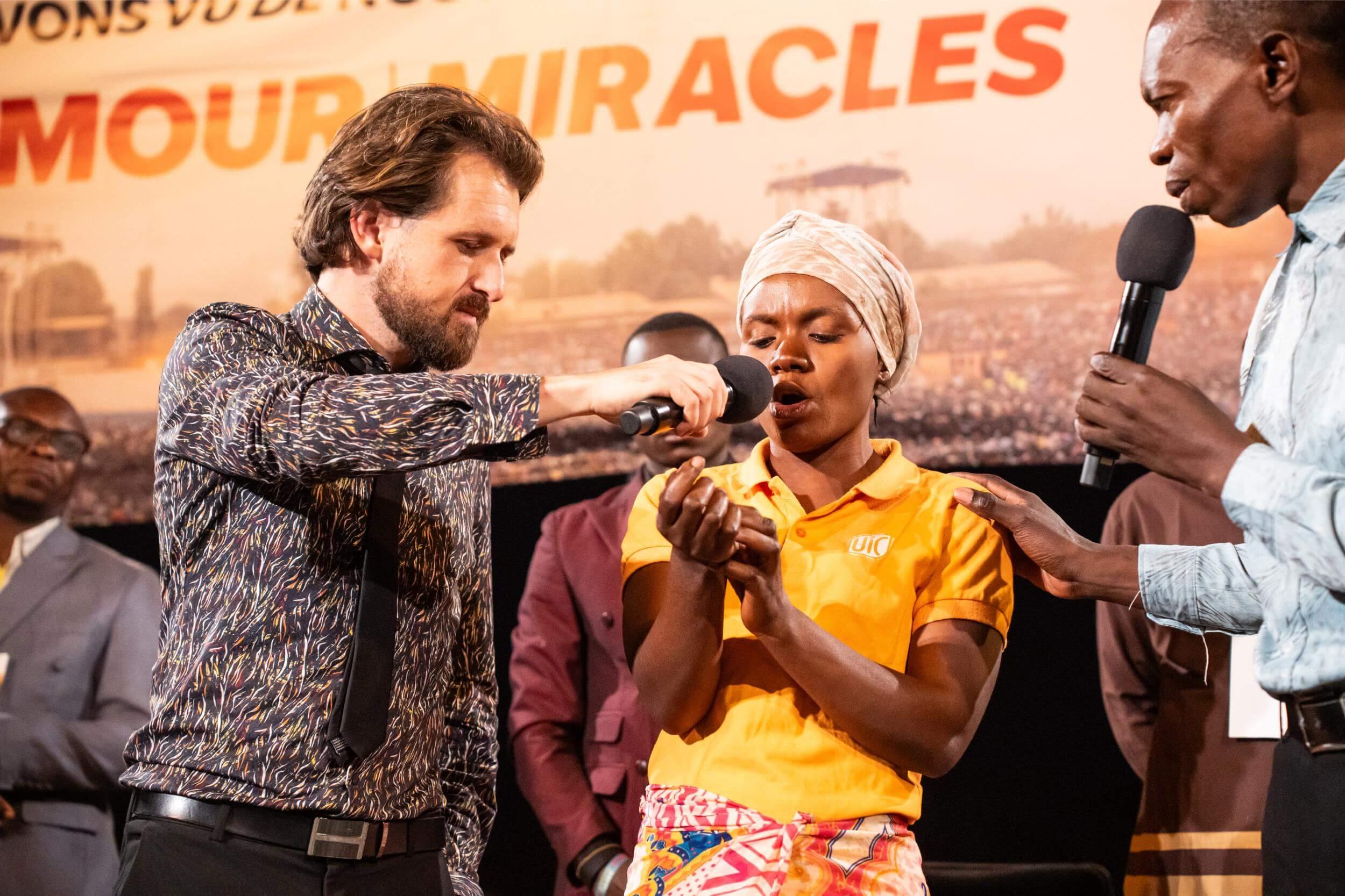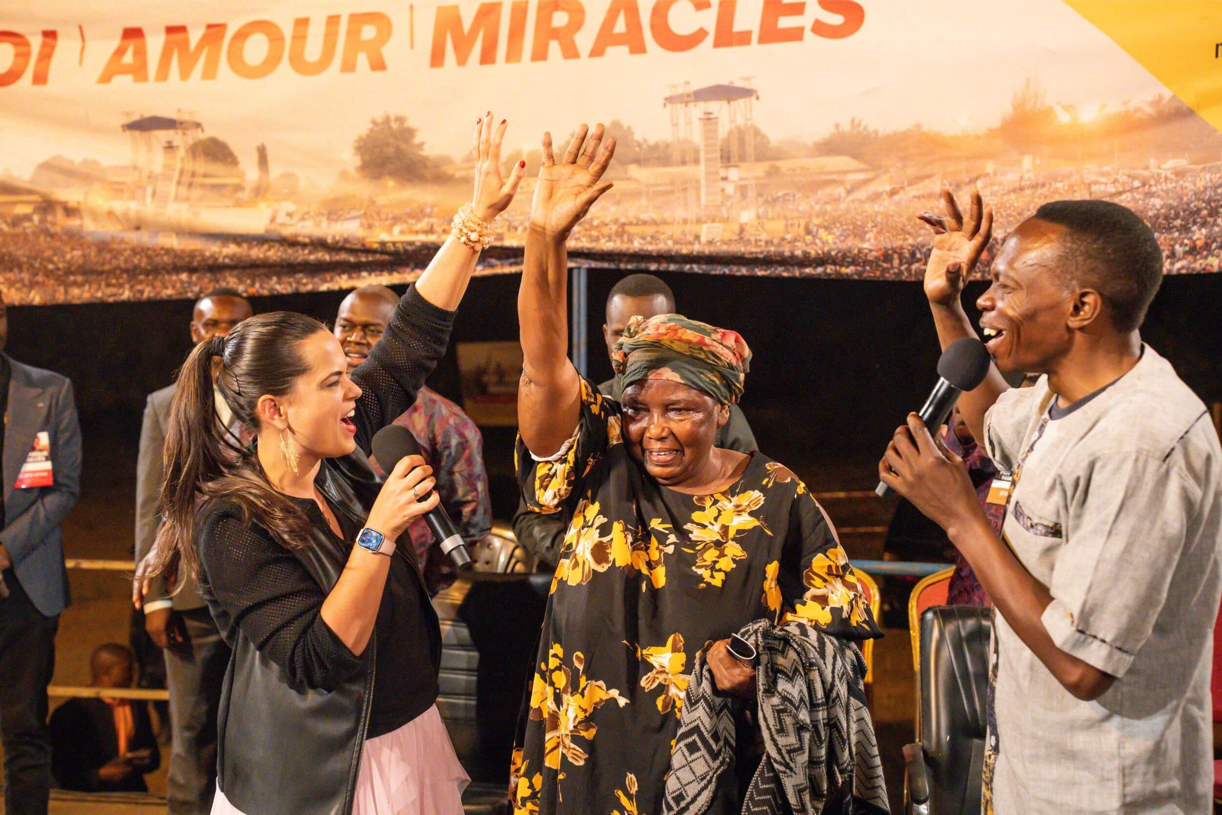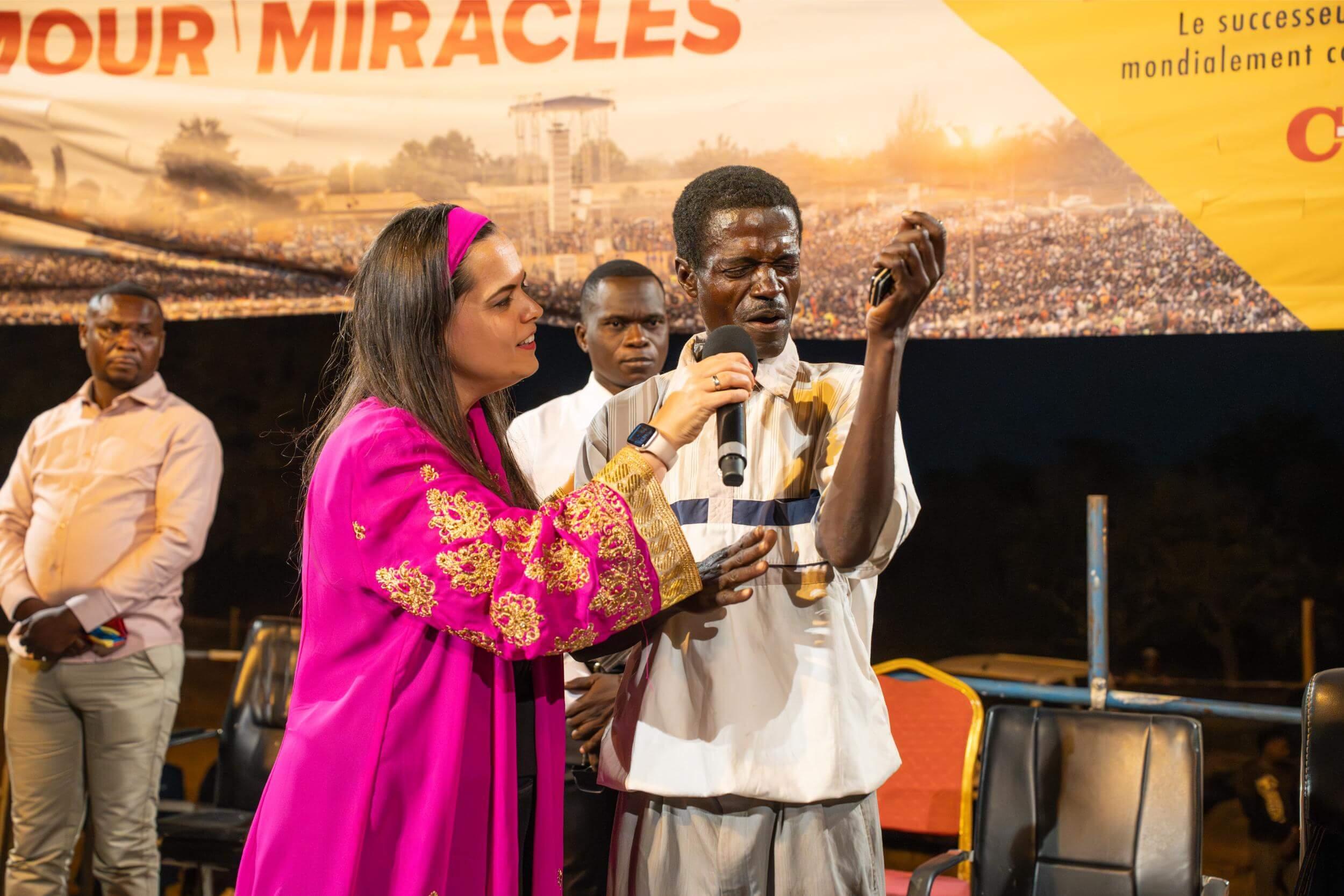 For nearly ten years, Exaucé suffered from sharp, persistent pain in his left leg. During the prayer for the sick, he experienced a powerful touch from God. The pain instantly vanished, and in an incredible moment of joy and freedom, Exaucé ran across the stage, pain-free for the first time in years! As the crowd erupted in praise, Exaucé burst into tears. Evangelist Dario had to catch him as he collapsed, shaking under the overwhelming emotion of this miracle.