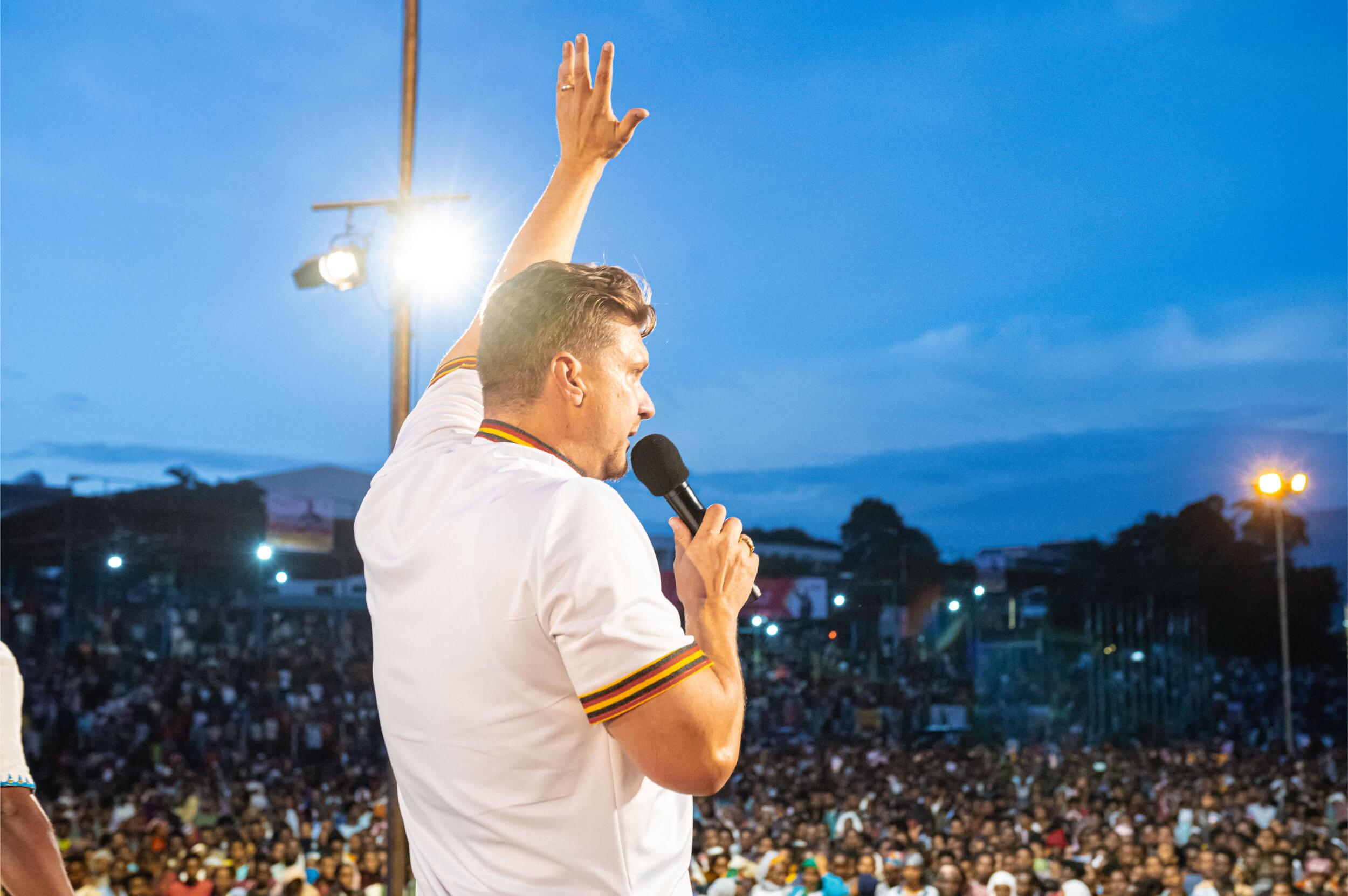 Meanwhile, in the city of Hosanna, the day began with heavy rain pouring down, driving away the crowd that had gathered. As the rain continued, Evangelist David Rotärmel – the Bootcamp graduate who is stationed there – watched the people scatter, seeking shelter. Moved by the unfolding disaster, the Vice Chairman of the crusade began to weep, lifting up a heartfelt prayer for the rain to cease and for the people to return. Amazingly, the rain quickly stopped, and the people returned to the field – in even greater numbers than before!