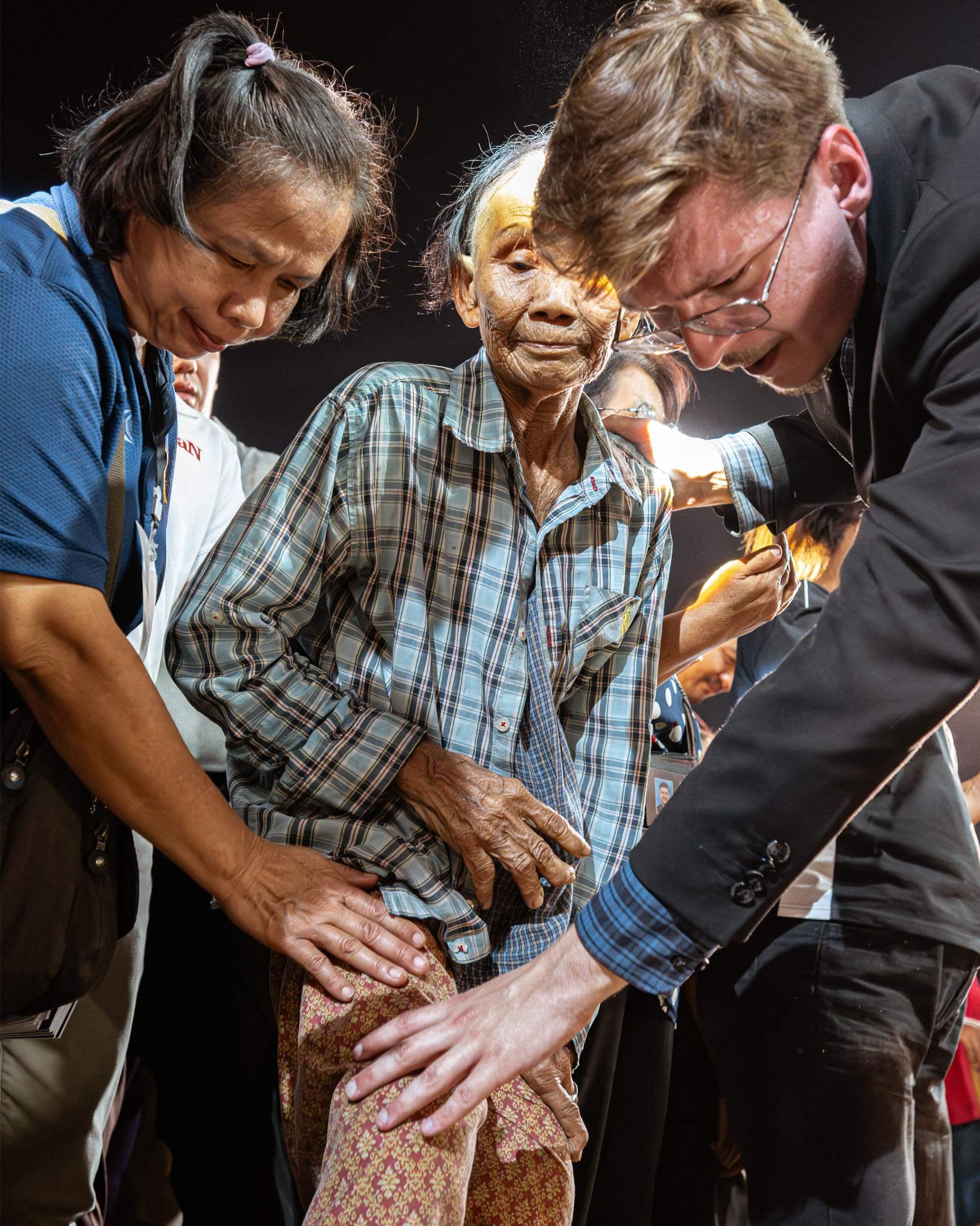 For 10 years, Yay Binkham walked bent over at 90° and had pain in her knees. But tonight, the Lord straightened her back, and she is healed. Now she can bend backwards and forwards, and she can run across the stage.