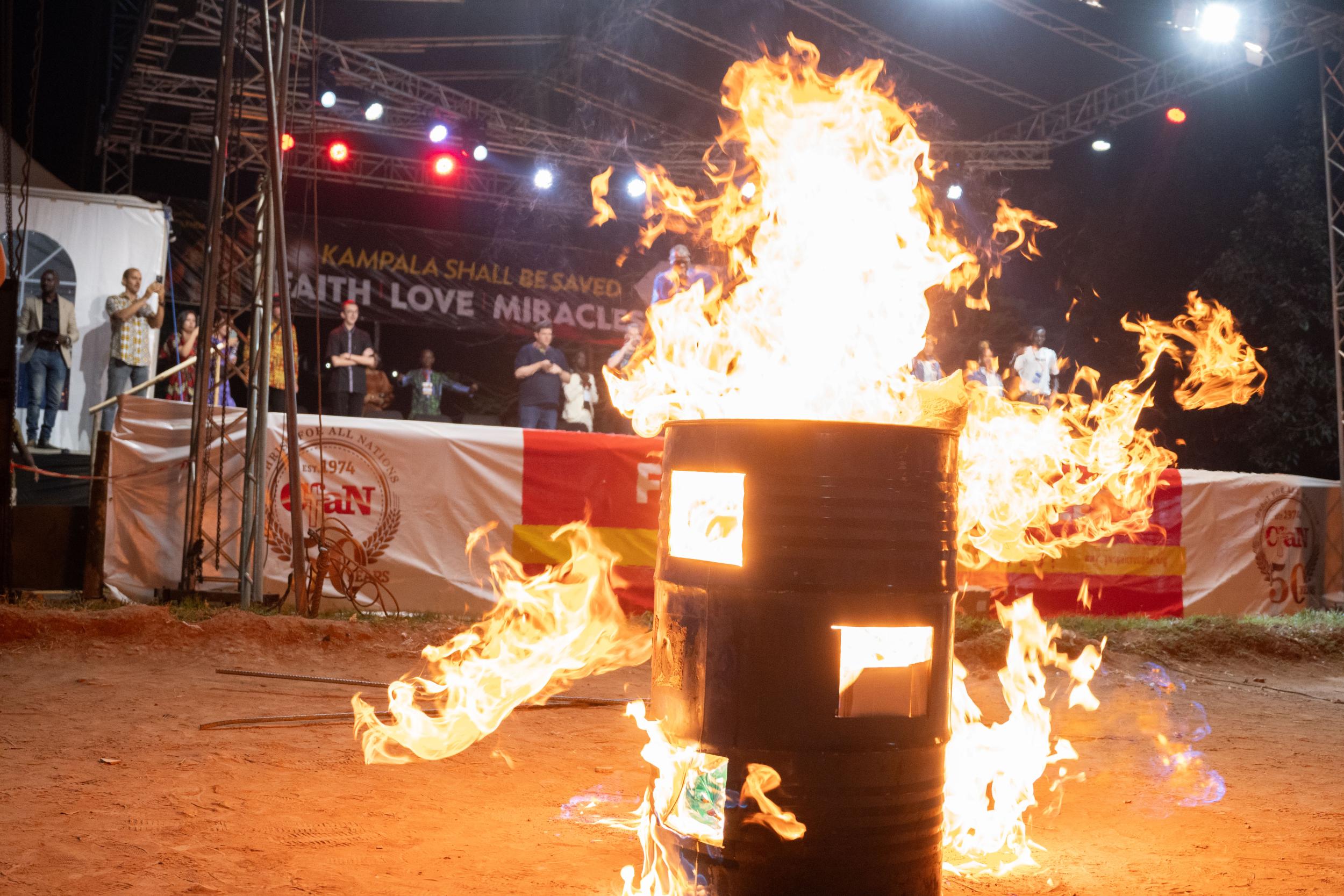 "After preaching the gospel we burned fetishes, charms, amulets and idols. In fact, the barrels were nearly full of all kinds of religious and cultish items along with witchcraft paraphernalia. I told the audience that tonight when the Holy Spirit convicts them, they should bring up their false idols, talismans, amulets, fetishes, juju etc. And I even gave them one last chance just before we burned the barrels. Even at the last minute, people were running to the altar and throwing away relics of their previous lives! We lit the barrels on fire, burned up that junk and broke the curses the devil has plagued this region with. The team and many of God’s people began to dance and celebrate around the defeat of the enemy. It felt like we had won a battle, and the celebration was a match for the victory Jesus has brought us. The devil was kicked out of Kampala!"